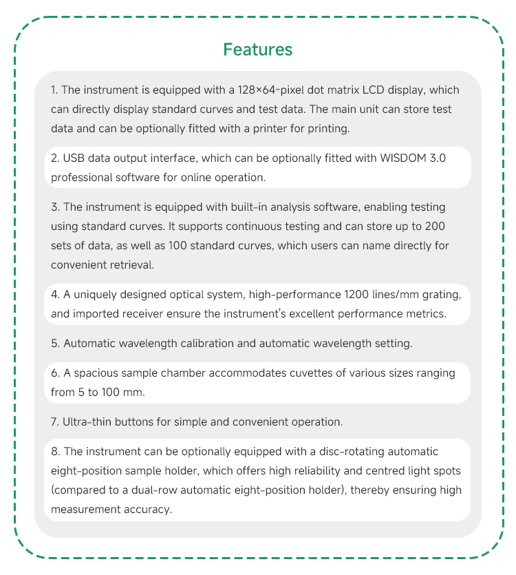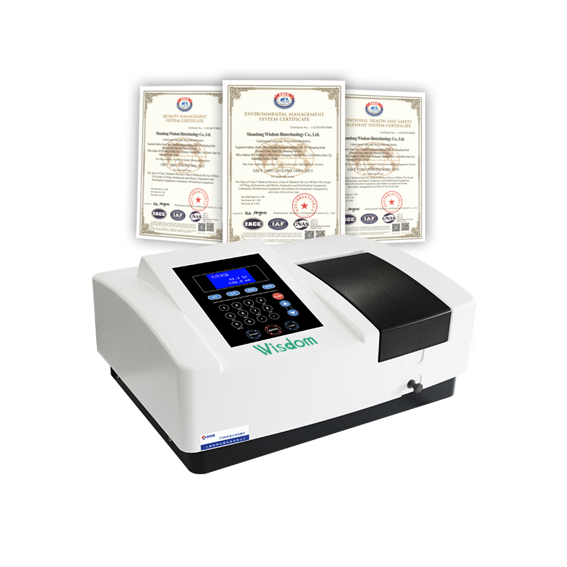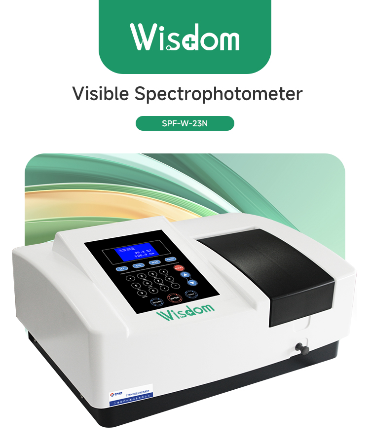 The Wisdom Scientific SPF-W-23N Visible Spectrophotometer is a high-performance analytical instrument featuring a dual-beam ratio detection optical system. It offers a wavelength range of 320-1100nm with ±0.5nm accuracy. Equipped with a 128×64 LCD display, it supports standard curves, auto-calibration, and USB data output for seamless laboratory operations.