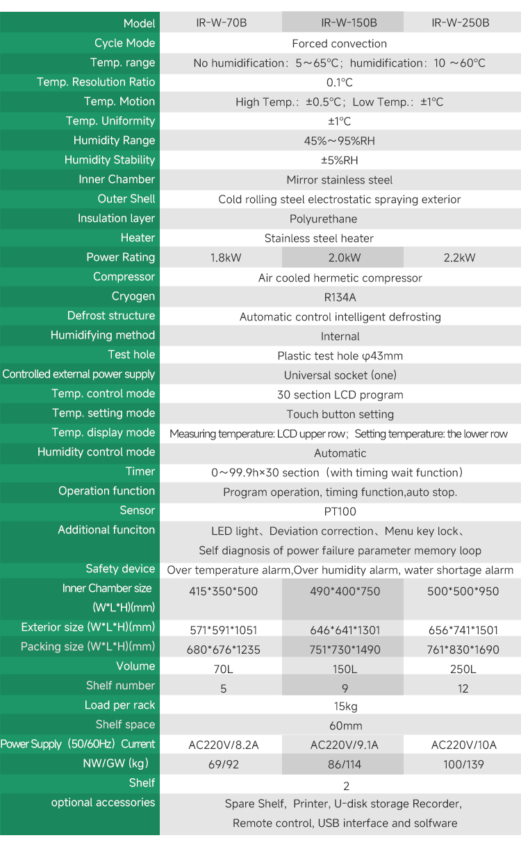 The Wisdom Scientific IR-W-B Series Constant Temperature and Humidity Incubator is a professional solution for environmental tests requiring precise climate control. It features a unique internal wind circulation system with a breeze fan to ensure superior temperature uniformity. The intelligent PID control system, paired with a PT100 sensor, provides automatic temperature and humidity management with a 30-stage program. Designed for reliability, it includes a double-door structure with stalinite glass, an intelligent defrosting function, and a built-in humidifying system with low water consumption and an integrated alarm.