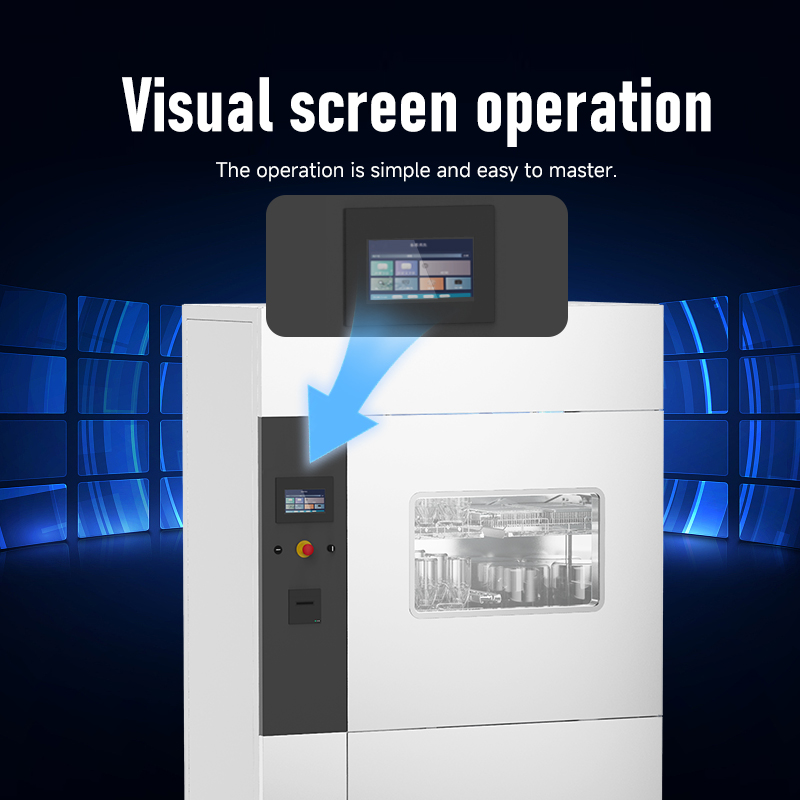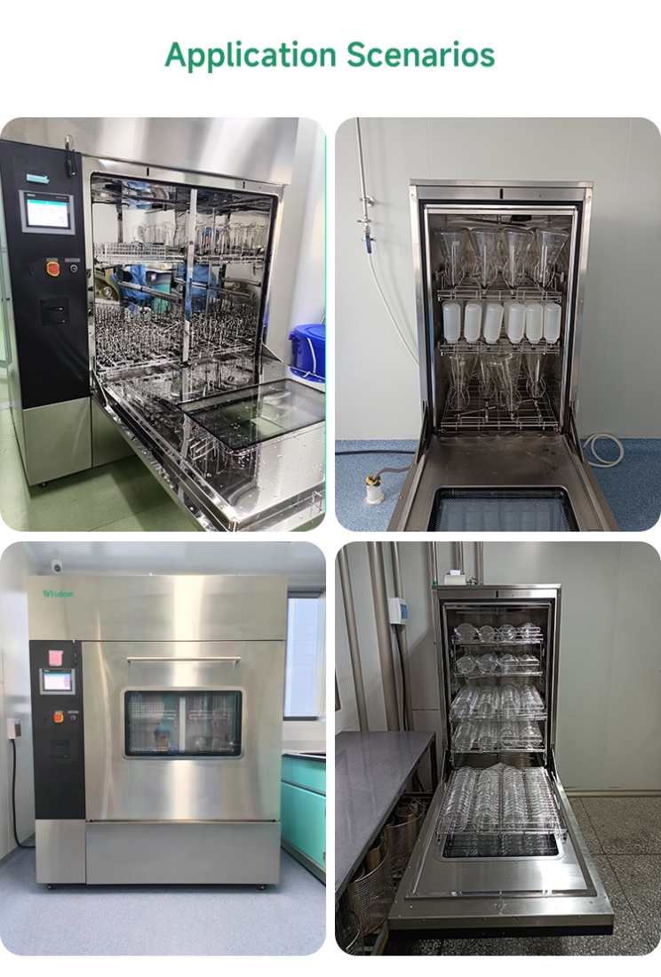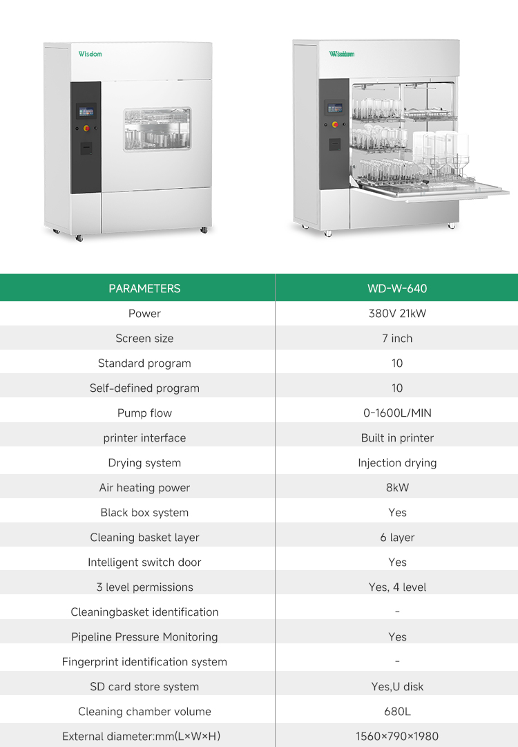 WD-W-640 Large Lab Washer: Massive 680L chamber with 6-layer cleaning. Industrial 0-1600L/min pump flow, built-in printer, and 8kW air heating power for maximum throughput and automated processing.